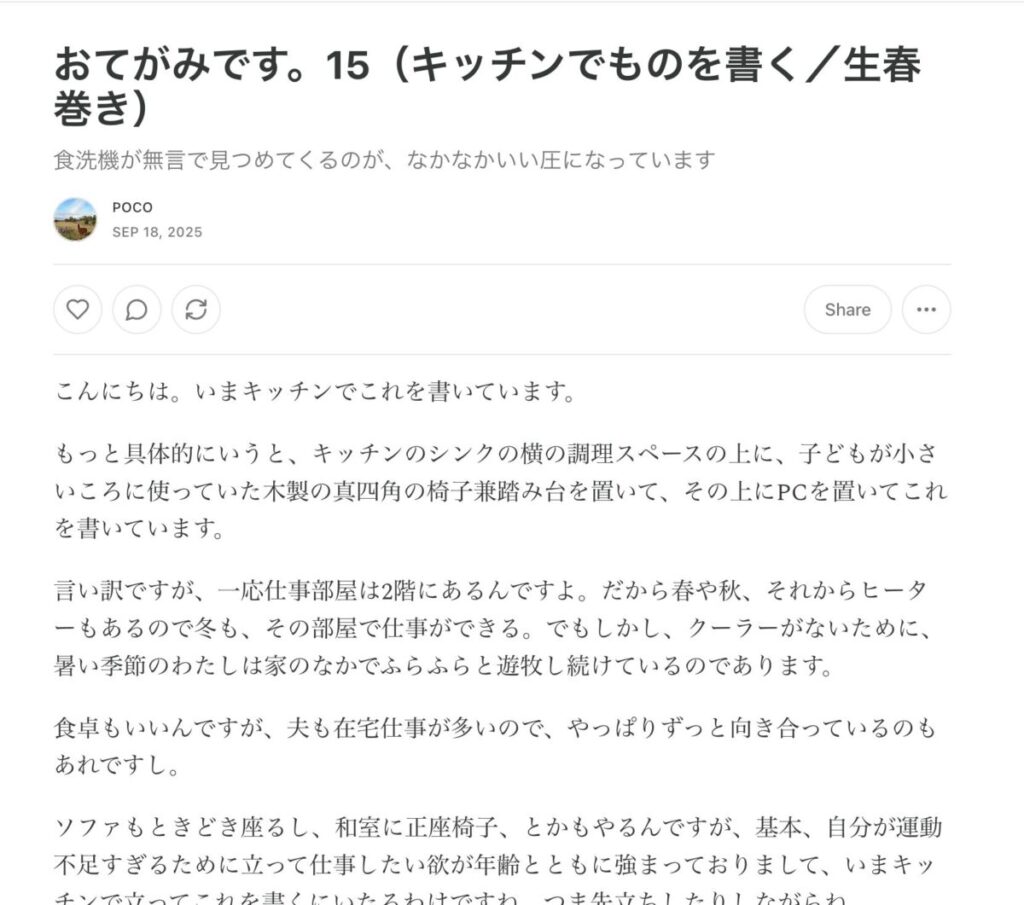 先日、そんな思いをChatGPTに相談してみたら、Substackなるサービスを薦められまして。ものは試しと、不定期配信のおてがみ(ニュースレター)を始めてみることにしました。